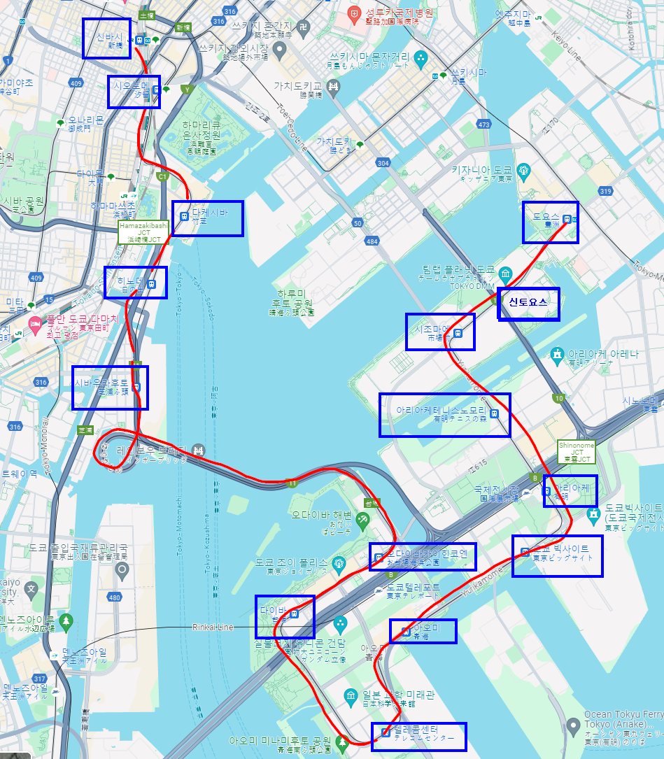 지도 보면 아예 유리카모메가 담당하는 영역이 아닌 루트로 가는 것을 알 수 있다.